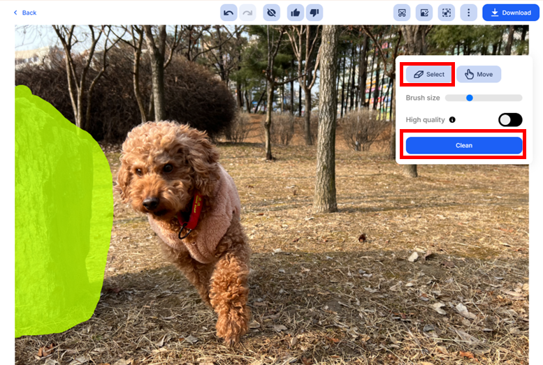 오른쪽 상단의 작업 상자에서 선택(Select) 버튼을 클릭해, 지우고 싶은 영역을 마우스로 드래그합니다. 그러면 아래처럼 드래그한 부분이 형광색으로 칠해집니다. 영역을 모두 칠했다면 작업 상자 하단의 지우기(Clean) 버튼을 눌러주세요.