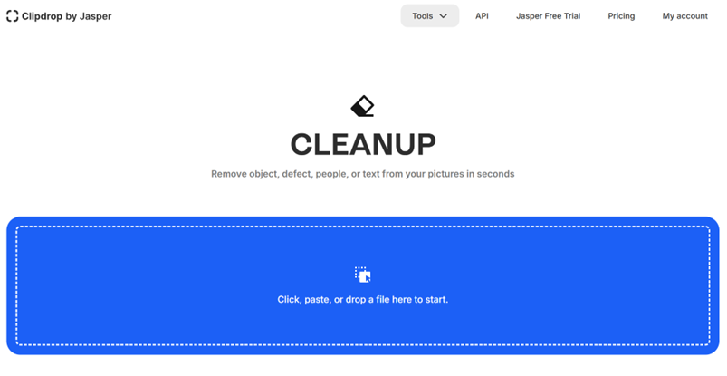 물체 지우기 기능은 이미지에서 불필요한 물체를 지우고, 빈 자리를 자연스럽게 배경으로 메꿔주는 기능입니다. 먼저, 화면 중앙의 파란색 영역에 이미지 파일을 업로드합니다.